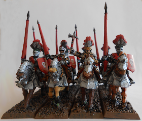 I do have a 4th ed army and these guys are part of it so I've painted them up in the familiar red and white rather than the purple of this force. I'll be using them as +3 elites. Somewhere I have a bunch of the individual empire standard poles, if I ever find them one of these knights will get a conversion to a standard bearer. That's got to be a promotion.
